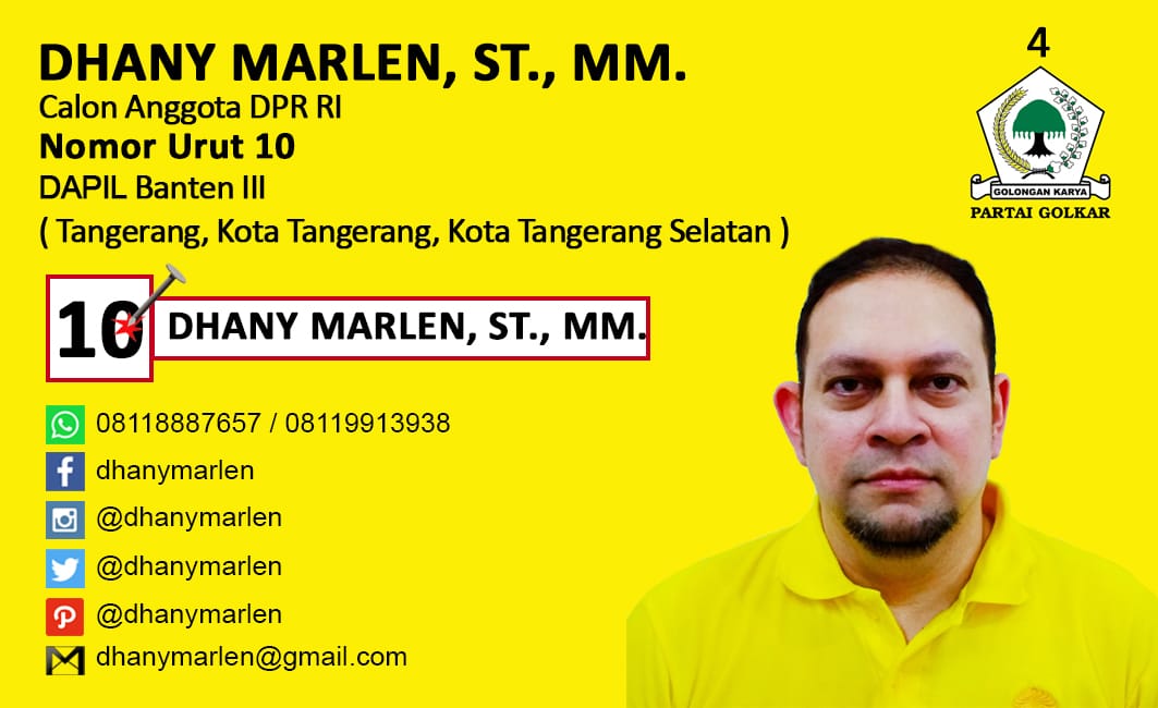 Kini Dhany Marlen ST, MM itu terjun ke dunia politik. Dalam Pemilihan Anggota DPR RI 2019, ia dicalonkan Partai Golkar dari Dapil III Banten yang meliputi Kota Tangerang, Kabupaten Tangerang dan Kota Tangerang Selatan.