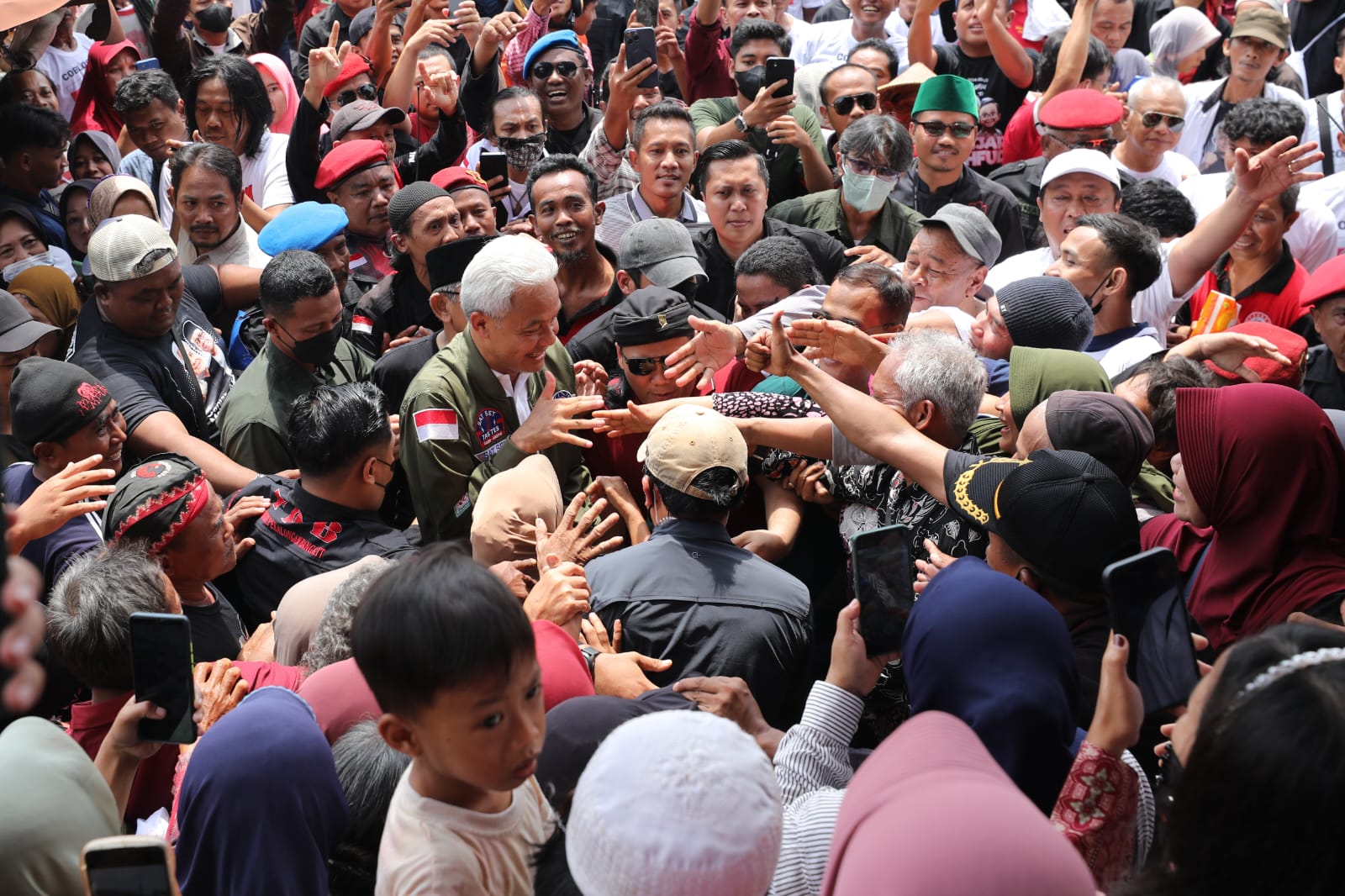 Kedatangan Ganjar disambut meriah oleh pedagang dan pengunjung pasar. Mereka turut meneriakkan ‘Ganjar Presiden, Ganjar Presiden’ ke Capres berambut putih itu.